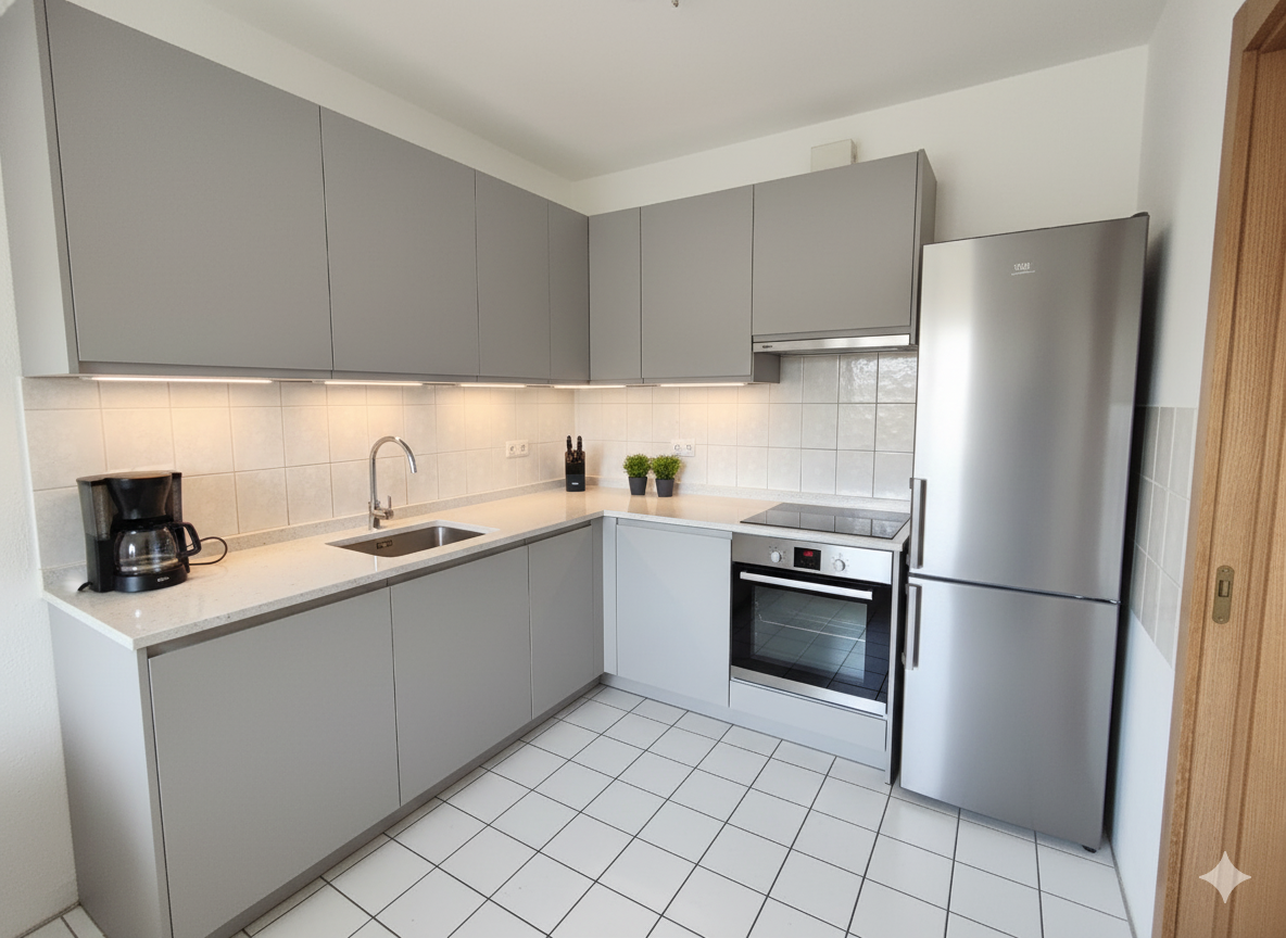 • 2025 Parkett abgeschliffen und neu versiegelt, Wände frisch geweißt, Küchen und Baddecke komplett erneuert, Silikonfugen an den Fernstern erneuert