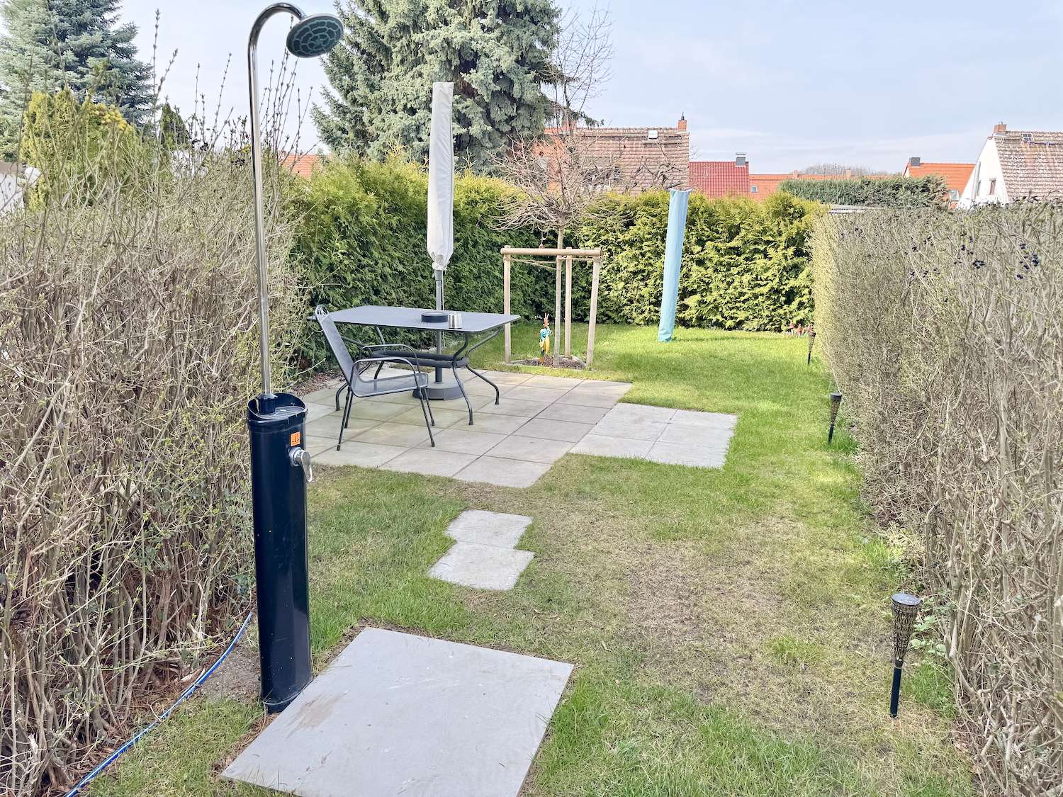 Ein besonderes Highlight ist Ihr eigener Gartenanteil: Diese private grüne Oase ist wunderbar sichtgeschützt und bereits liebevoll mit einer Gartenbank, einer gemütlichen Sitzecke, einer Außendusche, einem Schuppen sowie einer Wäschespinne ausgestattet. Besonders attraktiv: Das gesamte Gartenmobiliar ist bereits im Kaufpreis enthalten. Ein Außenwasserhahn ist ebenfalls vorhanden.
