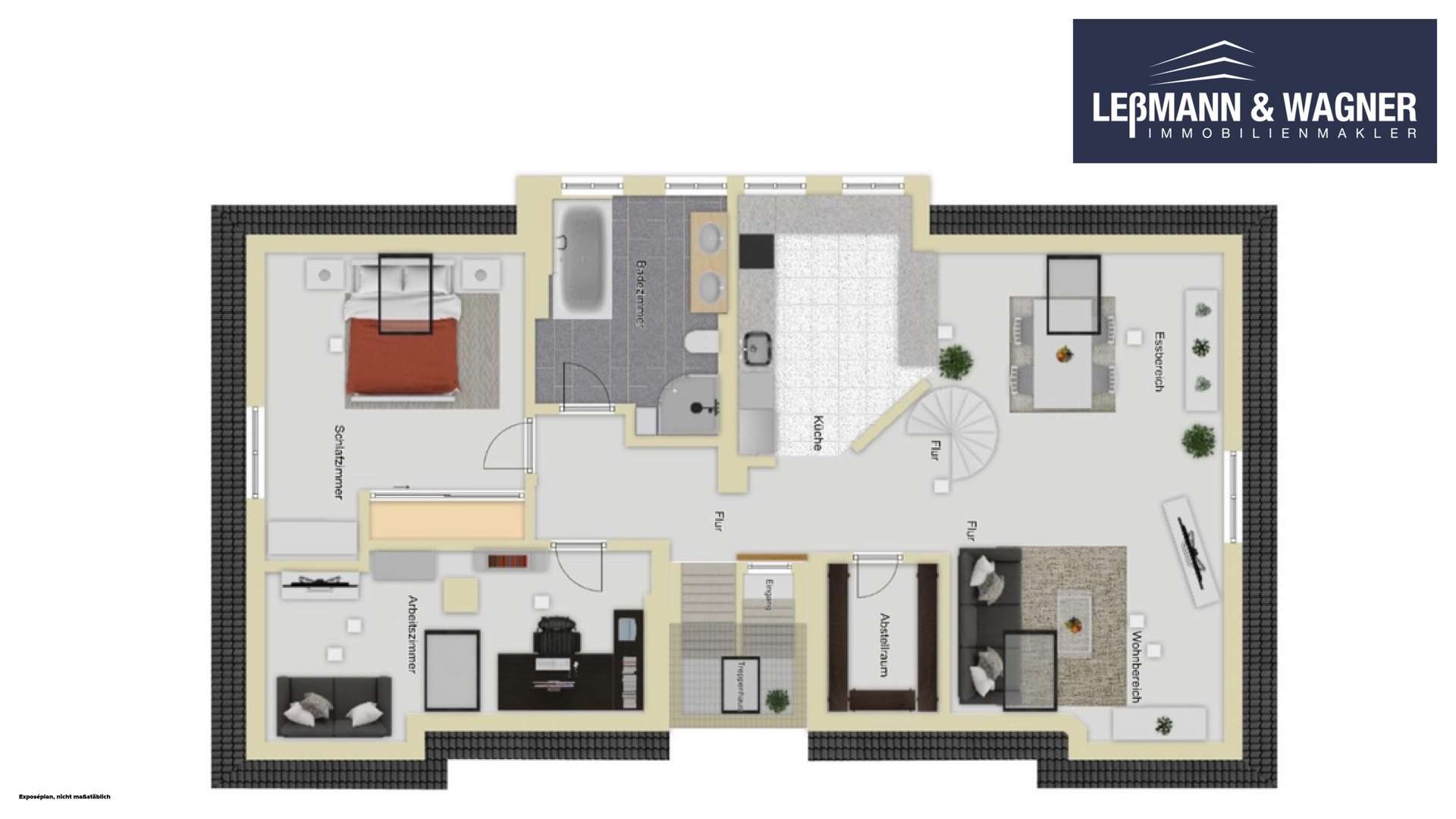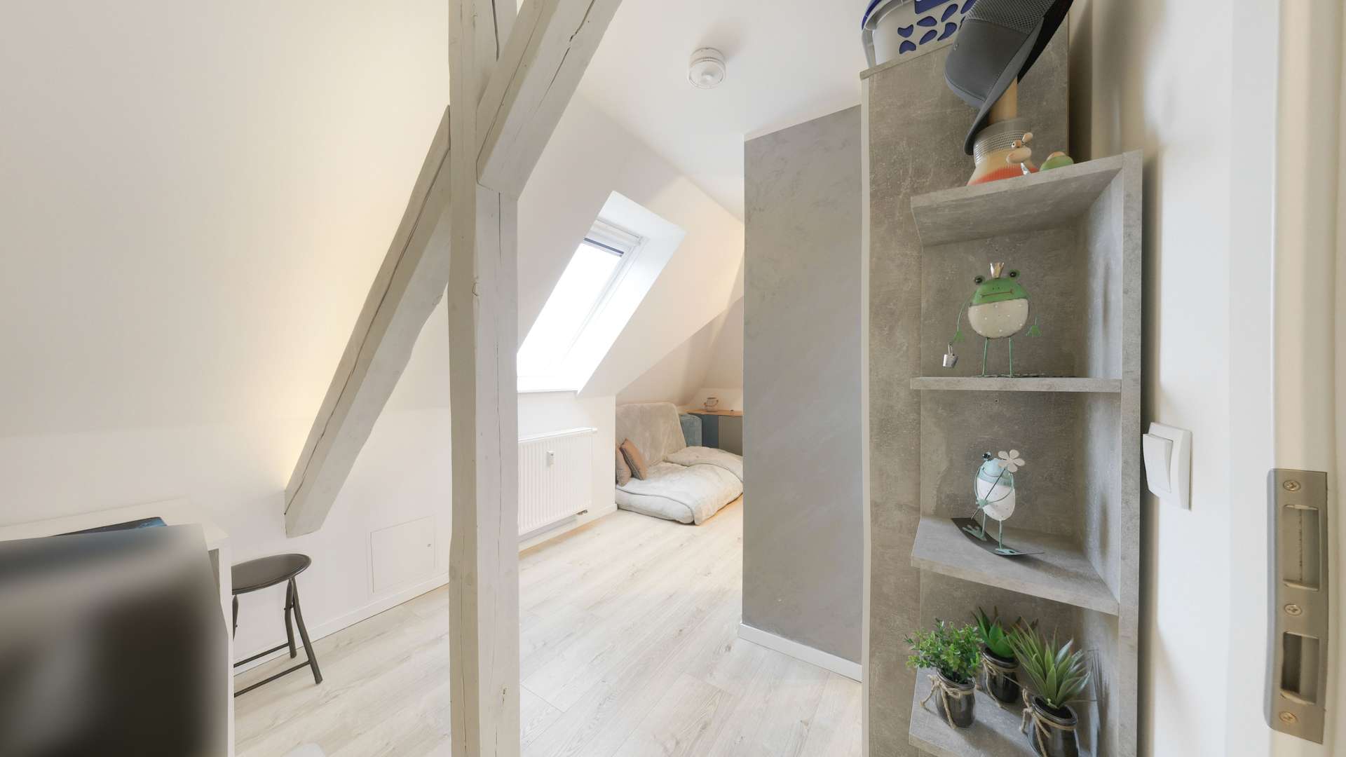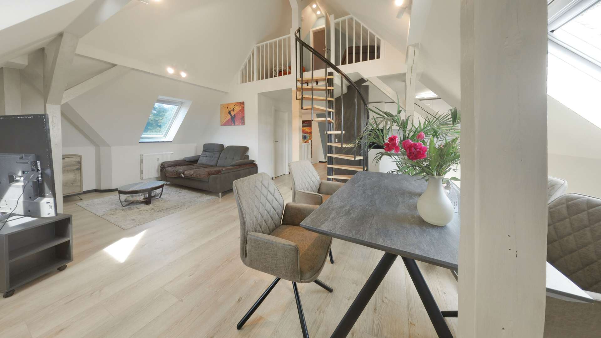 Ein Geheimnis dieser Wohnung lüftet sich eine Etage höher: Über eine geschwungene Wendeltreppe gelangen Sie in den ausgebauten Spitzboden. Ob als privater Rückzugsort, Hobbyraum oder Spielbereich für ältere Kinder – dieser zusätzliche Raum bietet Ihnen wertvolle zusätzliche Nutzfläche, die dank Beheizung das ganze Jahr über behaglich ist.