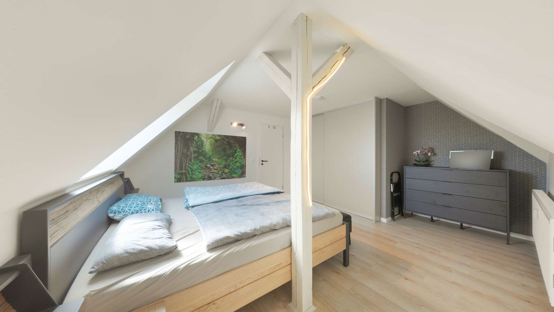 Das Hauptschlafzimmer überzeugt durch seine beeindruckenden Maße und eine hochwertige Ausstattung. Die stilvollen Einbaumöbel, wie das passgenaue Bett und der moderne Schiebetürschrank, unterstreichen das gehobene Ambiente und schaffen sofort Ordnung und Gemütlichkeit. Ein charmantes Detail ist das zweite Zimmer. Mit seiner markanten Balkenstruktur eignet es sich hervorragend als inspirierendes Home-Office oder gemütliches Kinderzimmer.