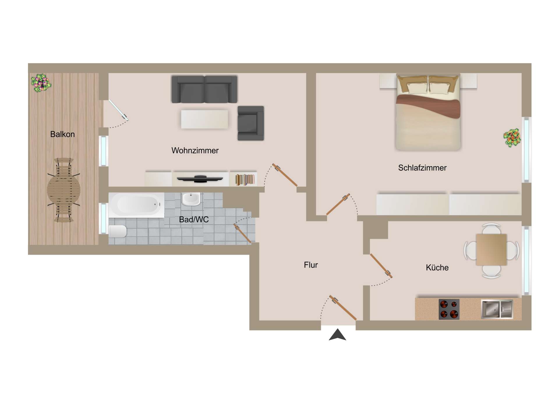 Die Wohnung bietet ein gut geschnittenes Wohnzimmer mit direktem Zugang zum Balkon. Aktuell nutzt der Mieter die Räume leicht abweichend vom klassischen Grundriss: Das kleinere Zimmer wird als Schlafzimmer genutzt, während der größere Raum als Wohnzimmer dient – eine Aufteilung, welche die Flexibilität der Wohnung unterstreicht.