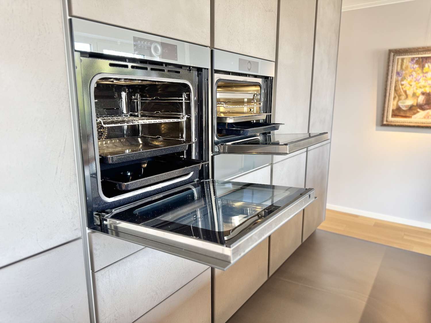 Das Herzstück der Wohnung ist der weitläufige Wohn- und Essbereich, der nahtlos in eine Gourmet-Küche übergeht, die keine Wünsche offen lässt. Die handgefertigten Betonspachtelfronten und ein professionelles, indirektes Beleuchtungskonzept setzen optische Maßstäbe. Technisch ist die Küche ein Meisterwerk: Eine exklusive Geräte-Kombination von V-ZUG – bestehend aus Backofen, Steamer und Wärmeschublade – trifft auf das effiziente Bora-Umluftsystem. Ein besonderes Highlight ist die Quooker-Armatur, die Ihnen auf Knopfdruck kochendes, gefiltertes oder gekühltes Wasser mit Kohlensäure liefert.
