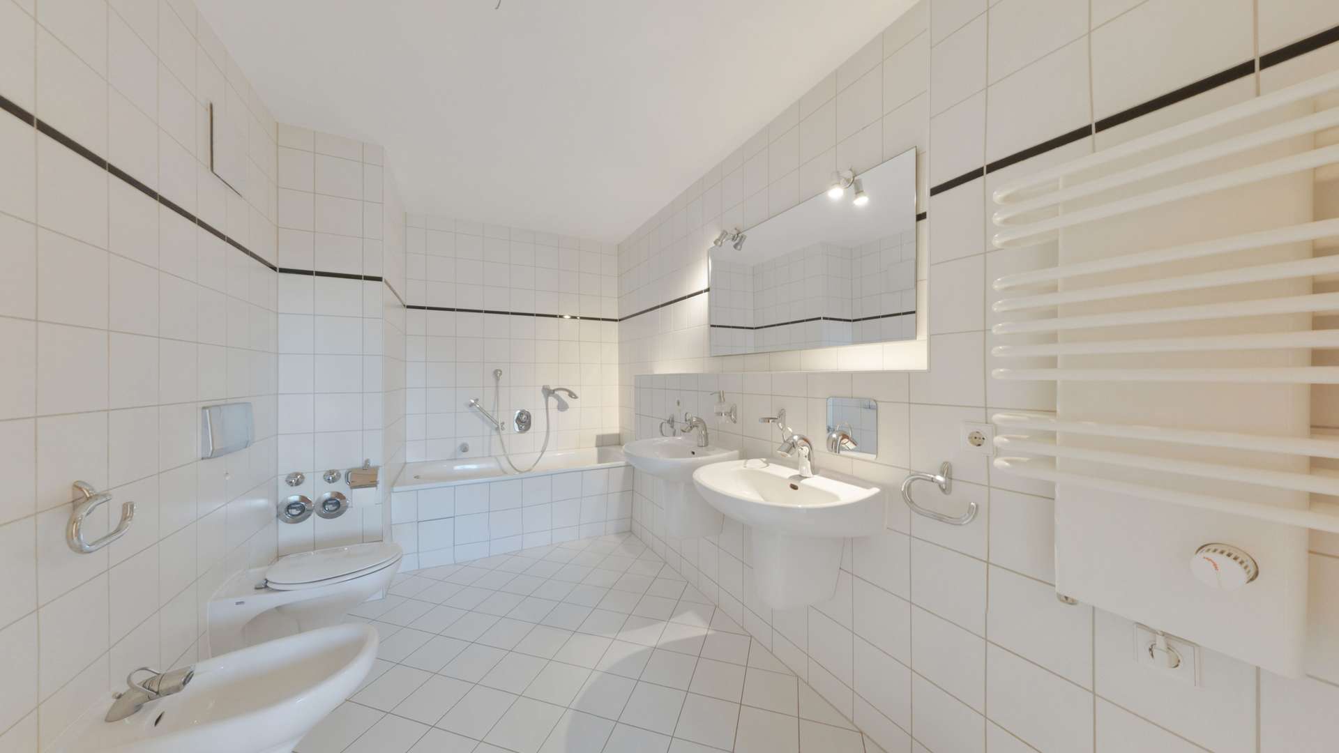 Das Badezimmer verfügt über eine Badewanne, ein Doppelwaschbecken, ein Bidet sowie einen Waschmaschinenanschluss. Ergänzt wird es durch ein separates Gäste-WC mit Dusche. Ein Abstellraum innerhalb der Wohnung bietet praktischen Stauraum für den Alltag.