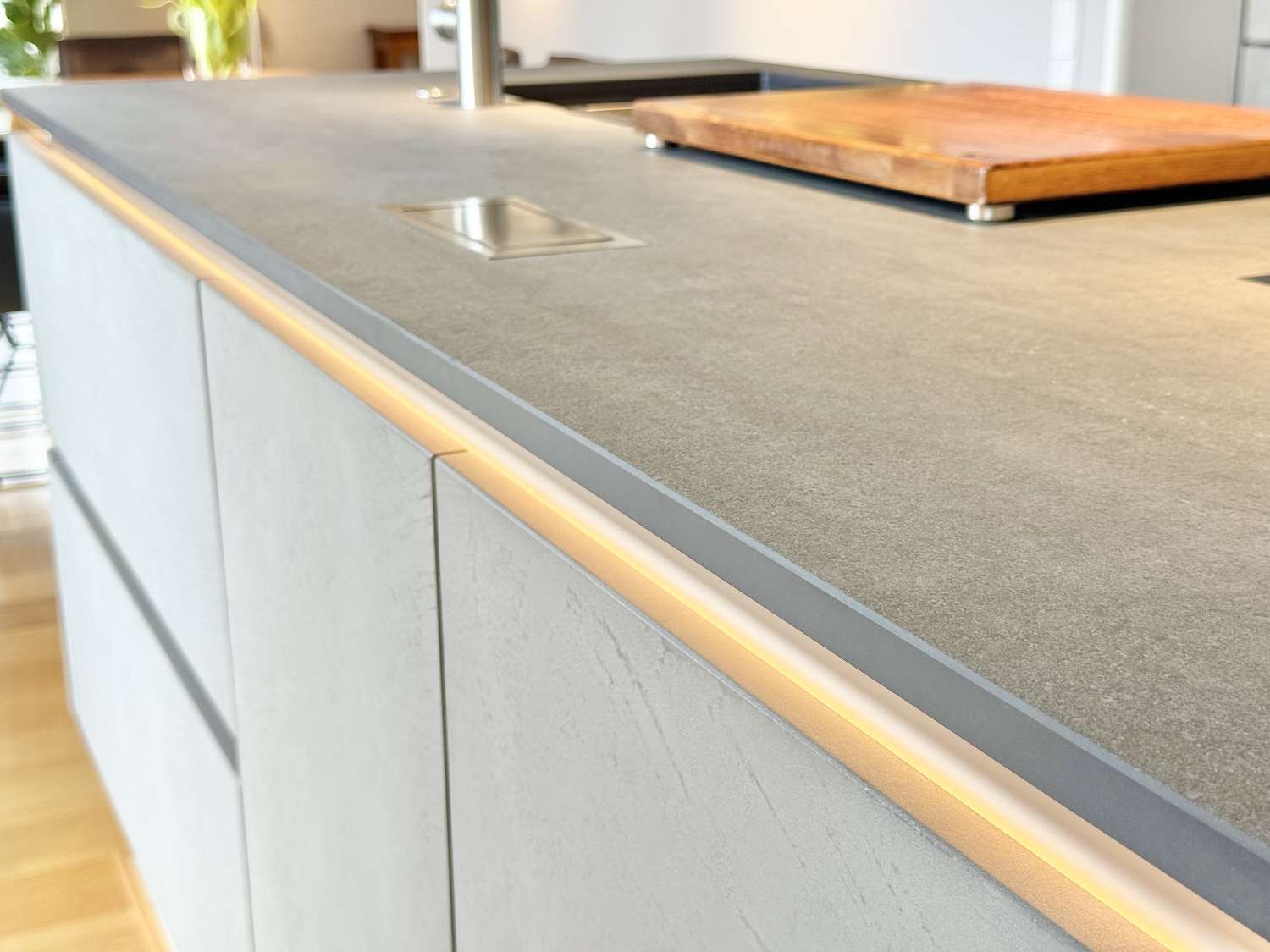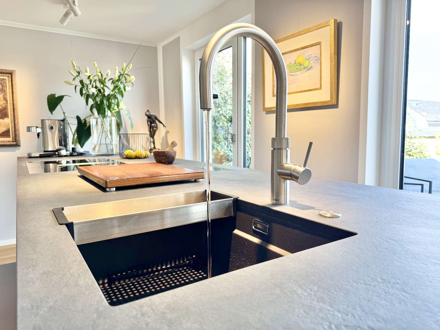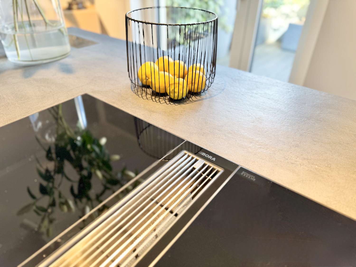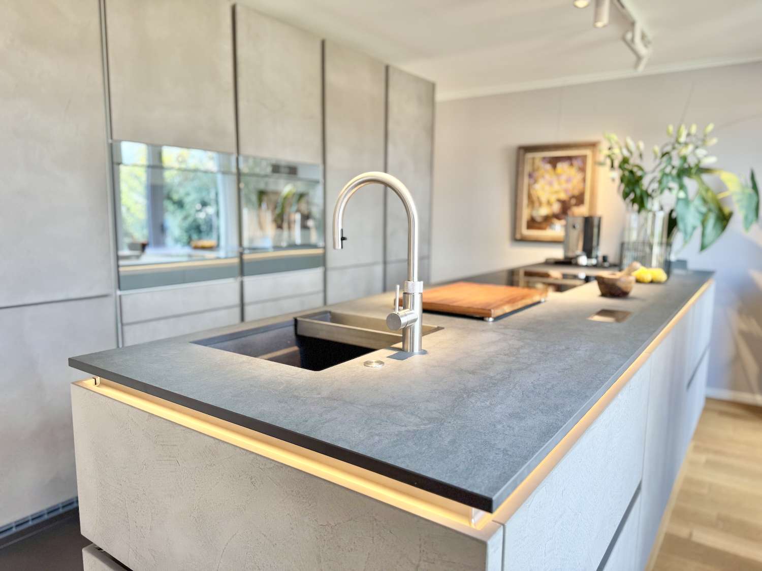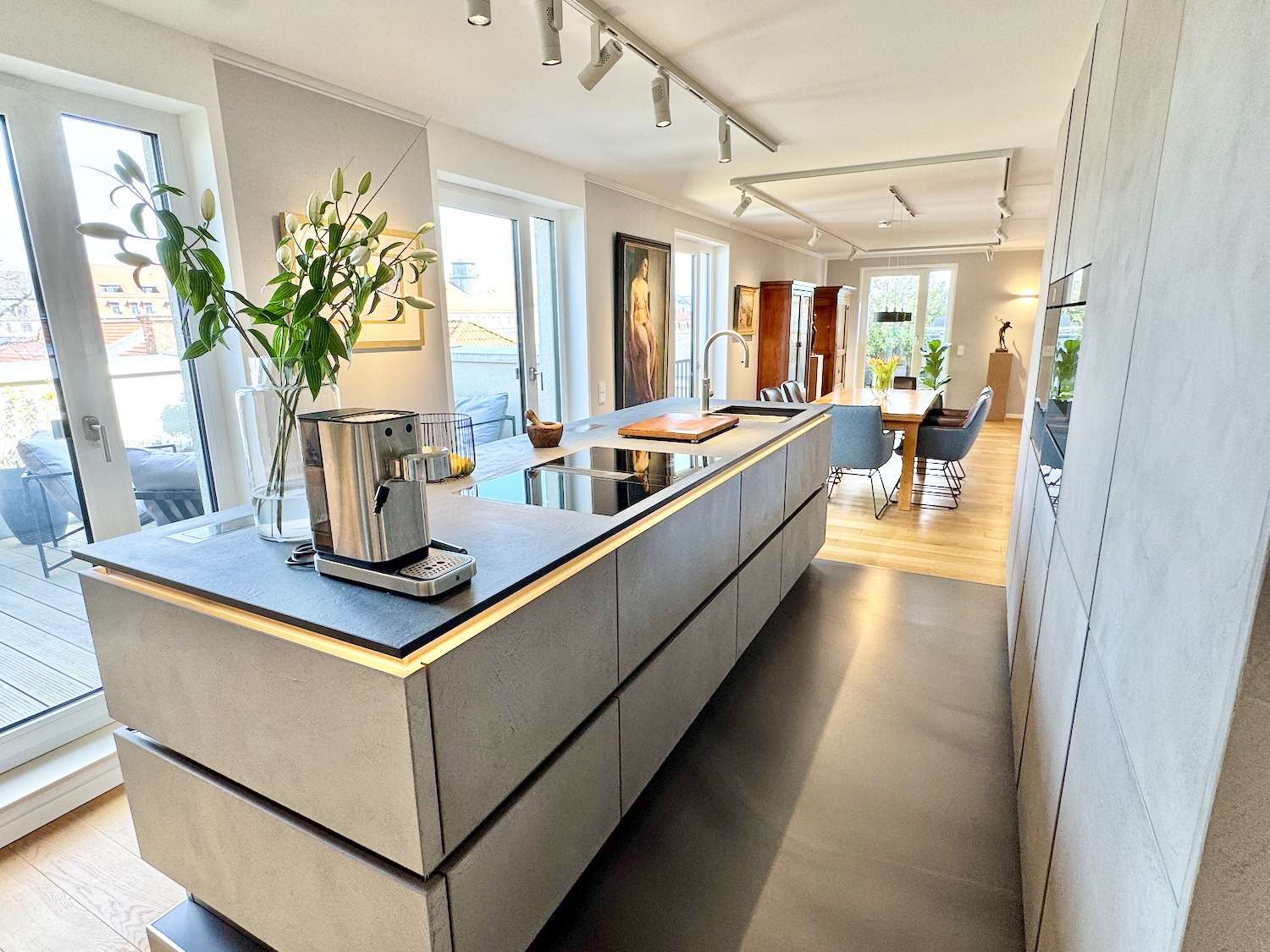 Das Herzstück der Wohnung ist der weitläufige Wohn- und Essbereich, der nahtlos in eine Gourmet-Küche übergeht, die keine Wünsche offen lässt. Die handgefertigten Betonspachtelfronten und ein professionelles, indirektes Beleuchtungskonzept setzen optische Maßstäbe. Technisch ist die Küche ein Meisterwerk: Eine exklusive Geräte-Kombination von V-ZUG – bestehend aus Backofen, Steamer und Wärmeschublade – trifft auf das effiziente Bora-Umluftsystem. Ein besonderes Highlight ist die Quooker-Armatur, die Ihnen auf Knopfdruck kochendes, gefiltertes oder gekühltes Wasser mit Kohlensäure liefert.